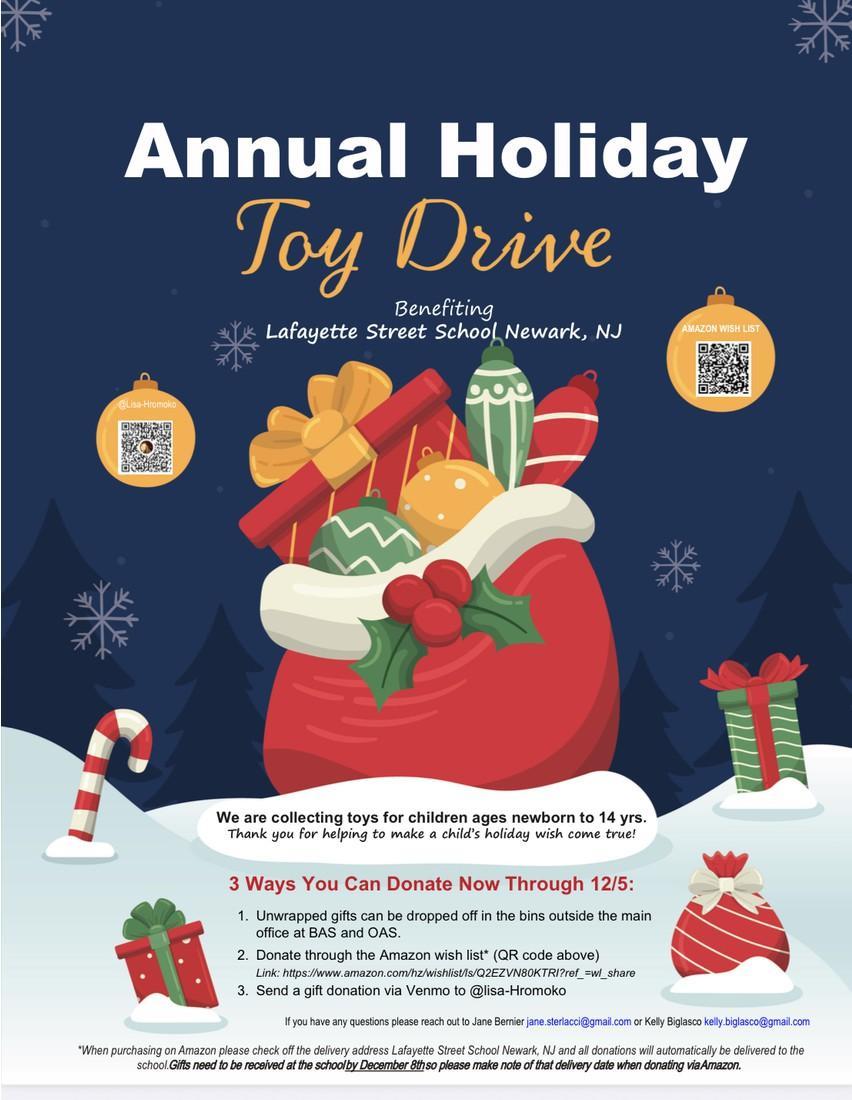 We are excited to announce that OAS is joining forces with BAS for the annual Holiday Toy Drive this year. We look forward to working with them on this initiative, which continues BAS's wonderful and long-standing commitment to the Lafayette Street School. The Toy Drive will run now through Friday, 12/5. We are collecting toys for children ages newborn to 14 years.